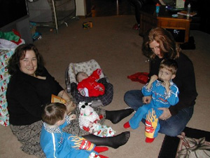 Julie, with grandsons Dylan, Daulton, and Devon (in carrier), and daughter-in-law Tee.